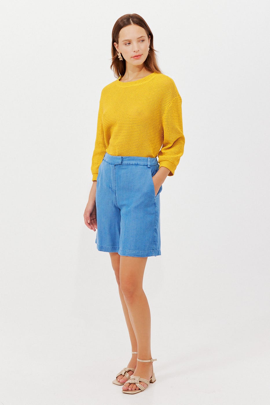 Top in fashionable mesh. In a subtle sheer effect. Plain colour shade. Straight shape. Round neckline. Short sleeves. Straight lower hemline. Matching topstitching. Easy to pair with jewellery and accessories.