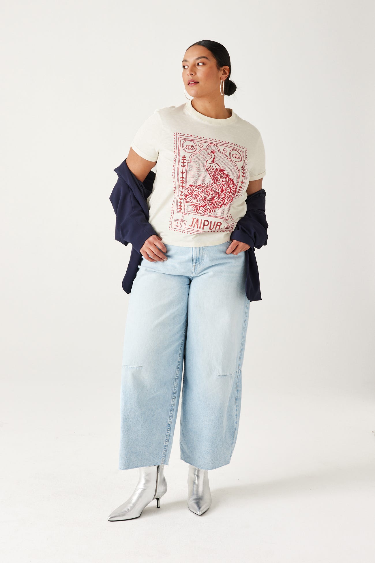 T-shirt with an eyecatching opeacock front motif. An Indian inspiration: the peacock is the national bird of India, symbolising grace, joy, beauty and love. Embroidered sequins and background patterned motifs. Straight shape. Round neckline. Short sleeves. Includes organic cotton. Natural fibers, grown without pesticides, GM nor chemical fertilisers to protect biodiversity.
