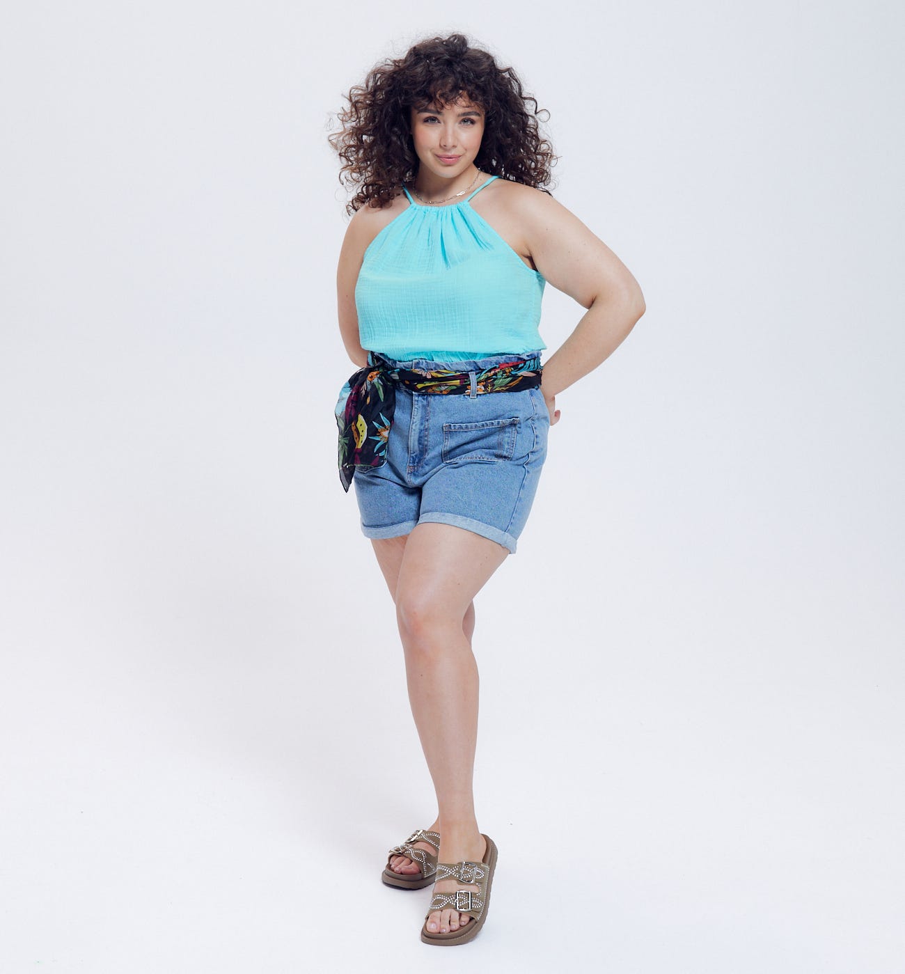 Lovely spring-summer fashion! Soft cotton gauze top in a pretty sorbet colour shade. Flared shape. Bold teardrop upper back with tassle ties. Frilly lower hemline for movement. In double layer cotton gauze. Light and airy, a pleasure to wear. With a subtle waffle finish.