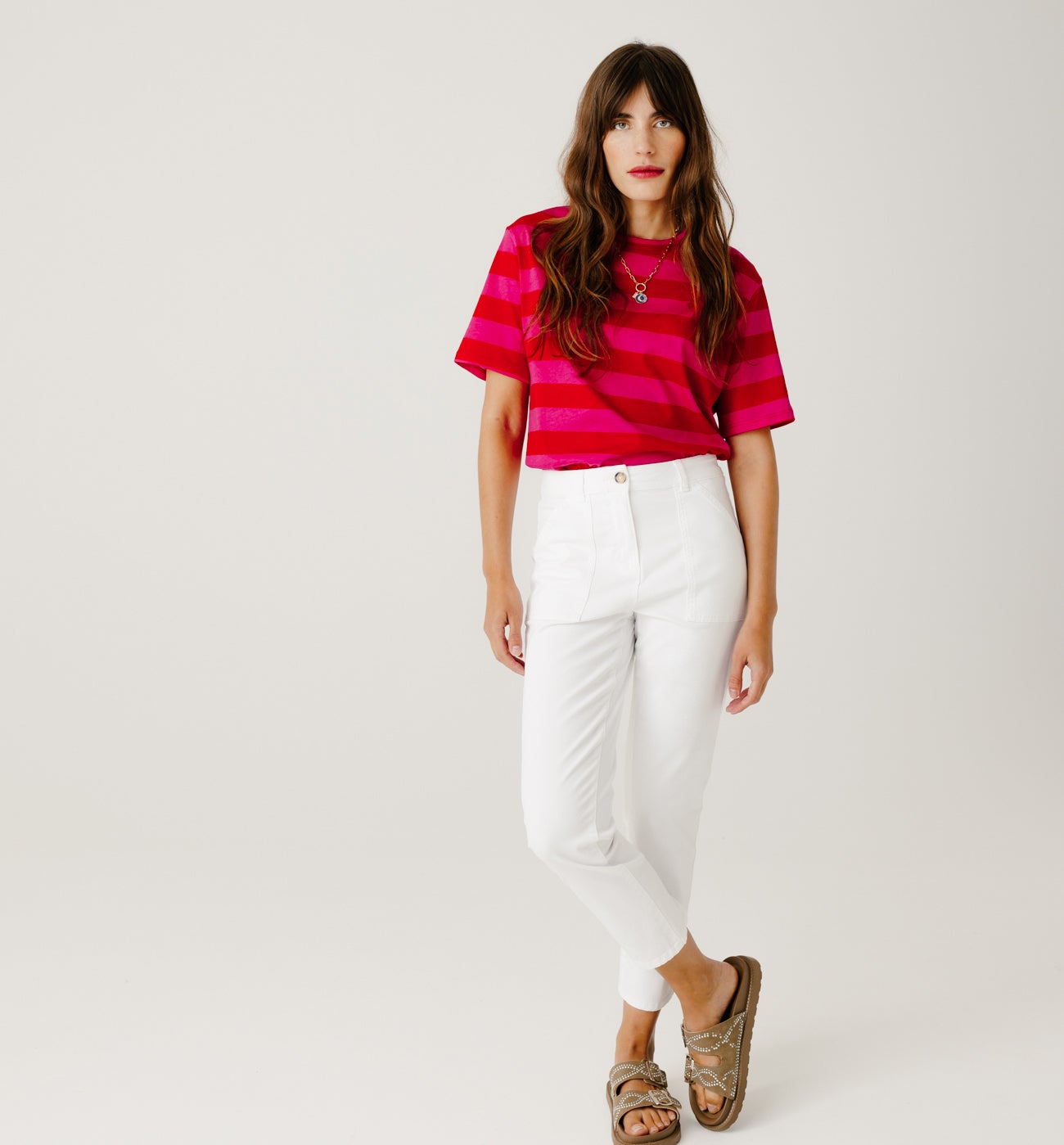 Spring summer wear! Soft plain cotton trousers. Effortlessly casual, easy to style in different ways. Medium rise. Ankle-skimming. Medium rise. Front button and zip. Beltloops. 4 patch pockets. Matching topstitching. Includes recycled cotton. From collected textiles, rewoven and reproduced into new clothes.