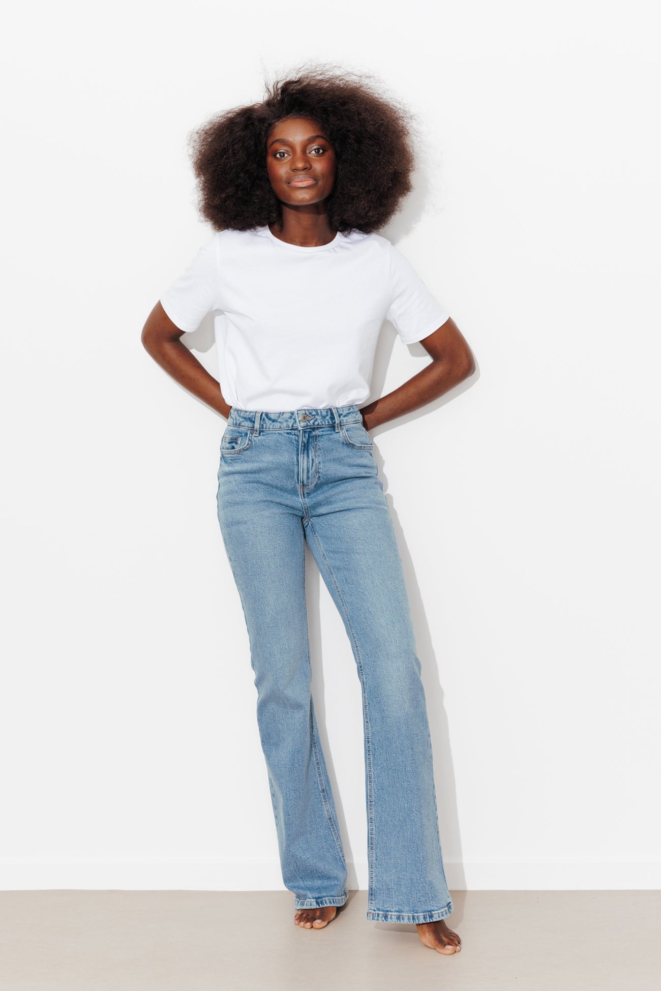 EUGENE jeans. Emblematic of 1970s fashion! For a leggy look. Create a fun hippie vibe or style more subtly. Flared shape. Extra long. Medium rise. In thick denim. Supple and slightly stretchy. Beltloops. Stud button and metal zip. 5 pockets. Includes organic cotton. Natural fibers, grown without pesticides, GM nor chemical fertilizers to protect biodiversity.