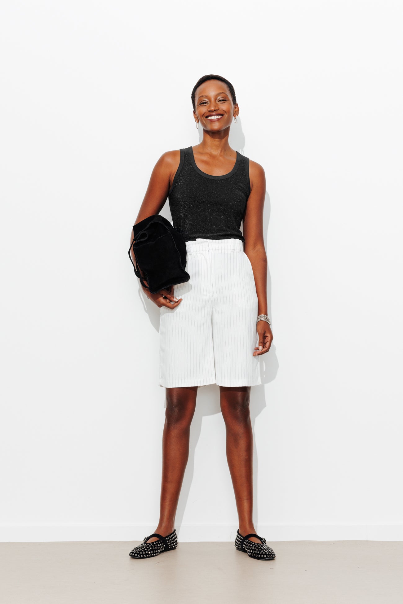 Sleeveless top with original modern fashion appeal. Fun and festive glam in a glitzy effect. Easy to wear and pair on all occasions. Fitted shape. Ribbed bias trim on the round neckline and shaped armholes. Topstitched lower edge. Matching stitching. Includes recycled fibres. Bound to be a wardrobe favourite!