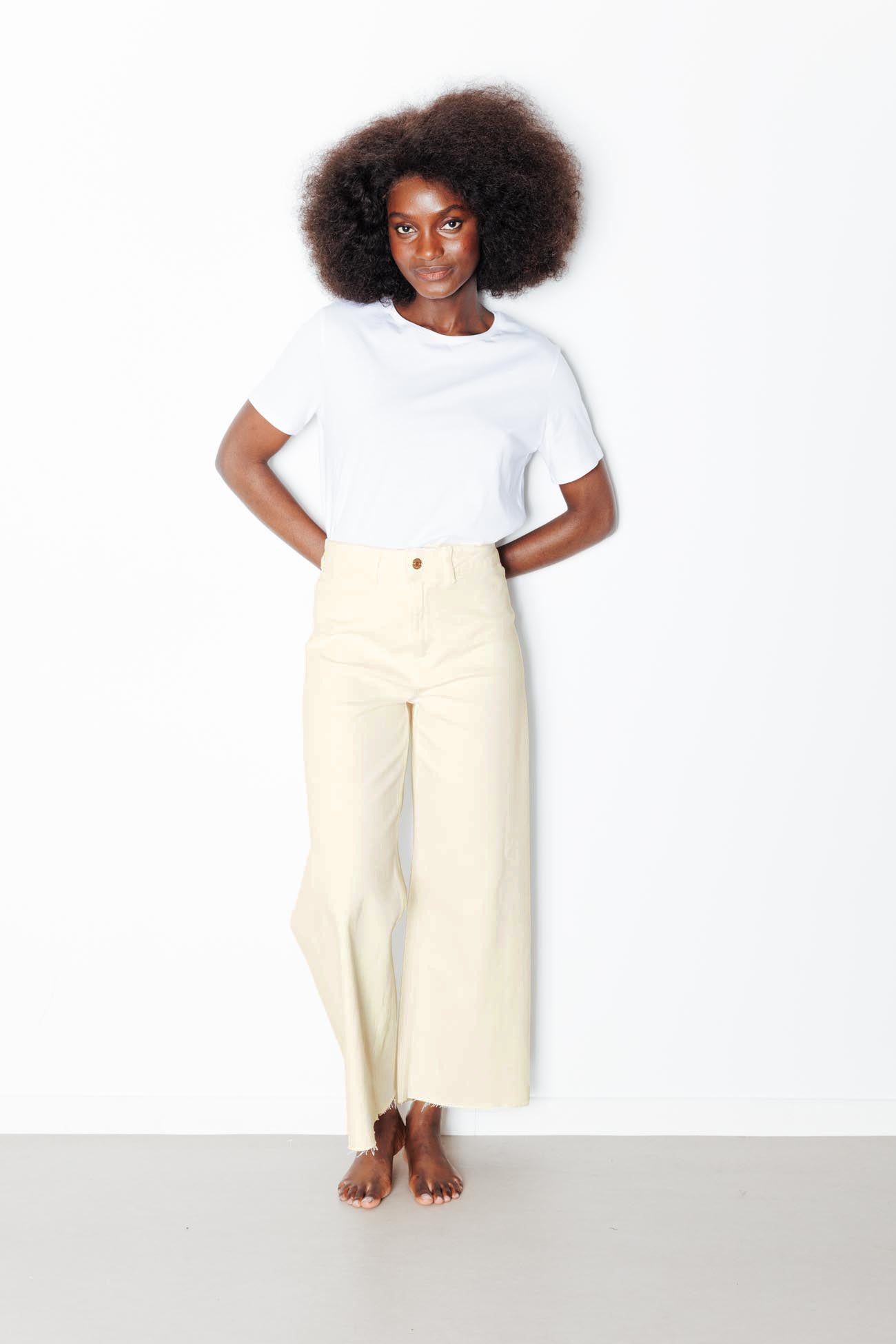 HECTOR handy jeans. Very wide cut. In stretch denim. Ankle length. Ultra-high waist. Stud button and zip. Beltloops. Pocketless front. Two back pockets. Raw lower edge: easy to shorten. Includes organic cotton. Natural fibers, grown without pesticides, GM nor chemical fertilizers to protect biodiversity.