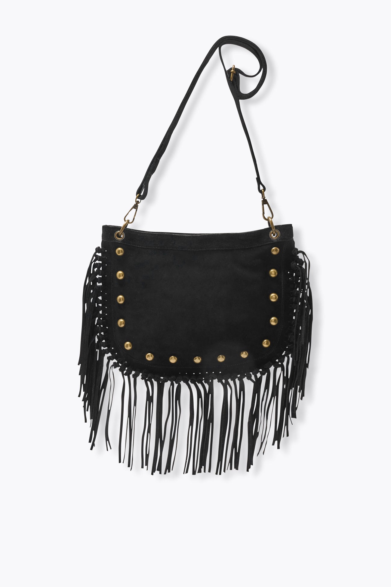 Soft suede leather bag. Featuring long knotted fringes and studs in vintage-effect metal. Iconic Far West style. In pure split cowhide leather. Matching satin lining. Zipper. Adjustable removable strap. Carry over the arm or over the shoulder. Vintage-effect metal trim. Zipped pocket and to open pockets on the inside. Goes great with a boho dress, faded jeans or Aladdin-style trousers. A lovely gift inspiration.