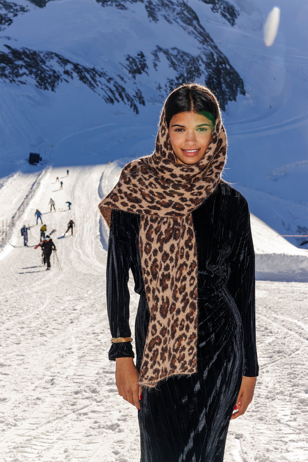 Stay warm and stylish. Big jacquard leopard scarf. Goes great with a trenchcoat, long wool coat, overshirt or bomber jacket. With cosy alpaca and wool in the blend. A lovely gift inspiration.