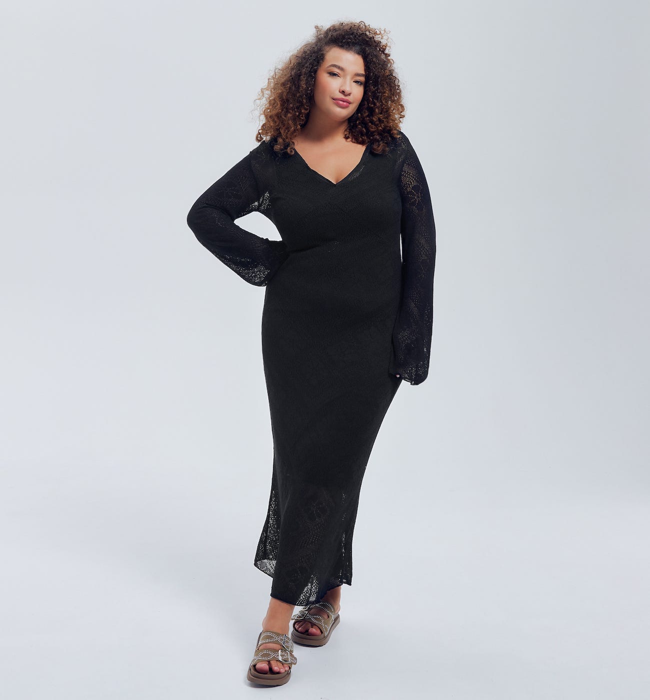 Boho dress with a retro inspiration. In a drapy hang. Long length. With beautiful openwork. Fitted shape. V-neckline. Bust section. Long pagoda sleeves. Slightly shorter lining.