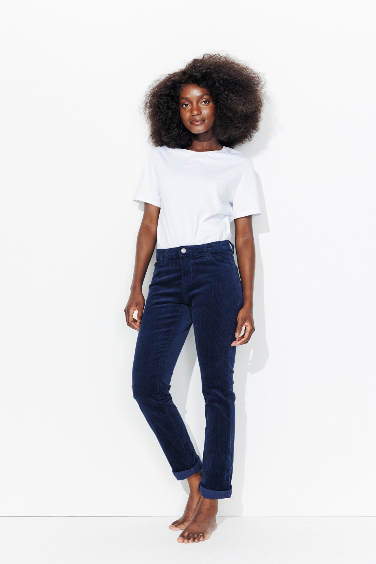 LUCIEN girlfriend trousers. A strong fashion look! Effortlessly casual. Perfect autumn-winter wear. Pair with moccasins, trainers or boots. In soft milliner corduroy. Slightly stretchy. Standard length. Medium rise. Stud button and metal zip. Beltloops. 5 pockets. Adjustable turn-ups. Matching topstitching. Includes recycled cotton.