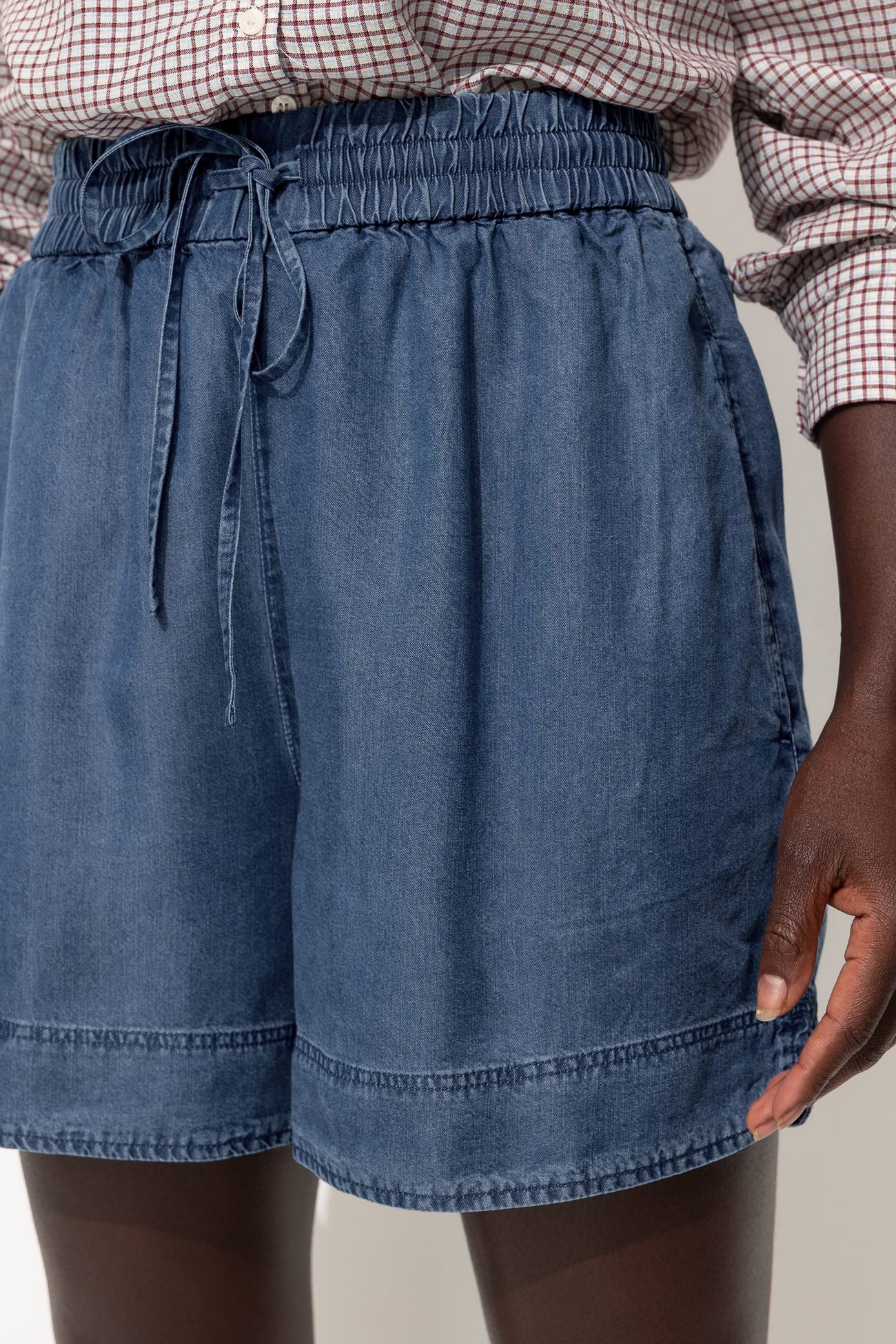 Soft supple shorts to go anywhere! They look great with sunglasses for fashion attitude in the city! Or slip on a straw sunhat for weekend wear. Opt for open sandals on holiday days. Flattering high smocked elasticated waist with drawstring. Two side pockets. Curved side slits. Matching stitching. Includes lyocell, a soft drapy fabric from eucalyptus wood pulp from managed forests.