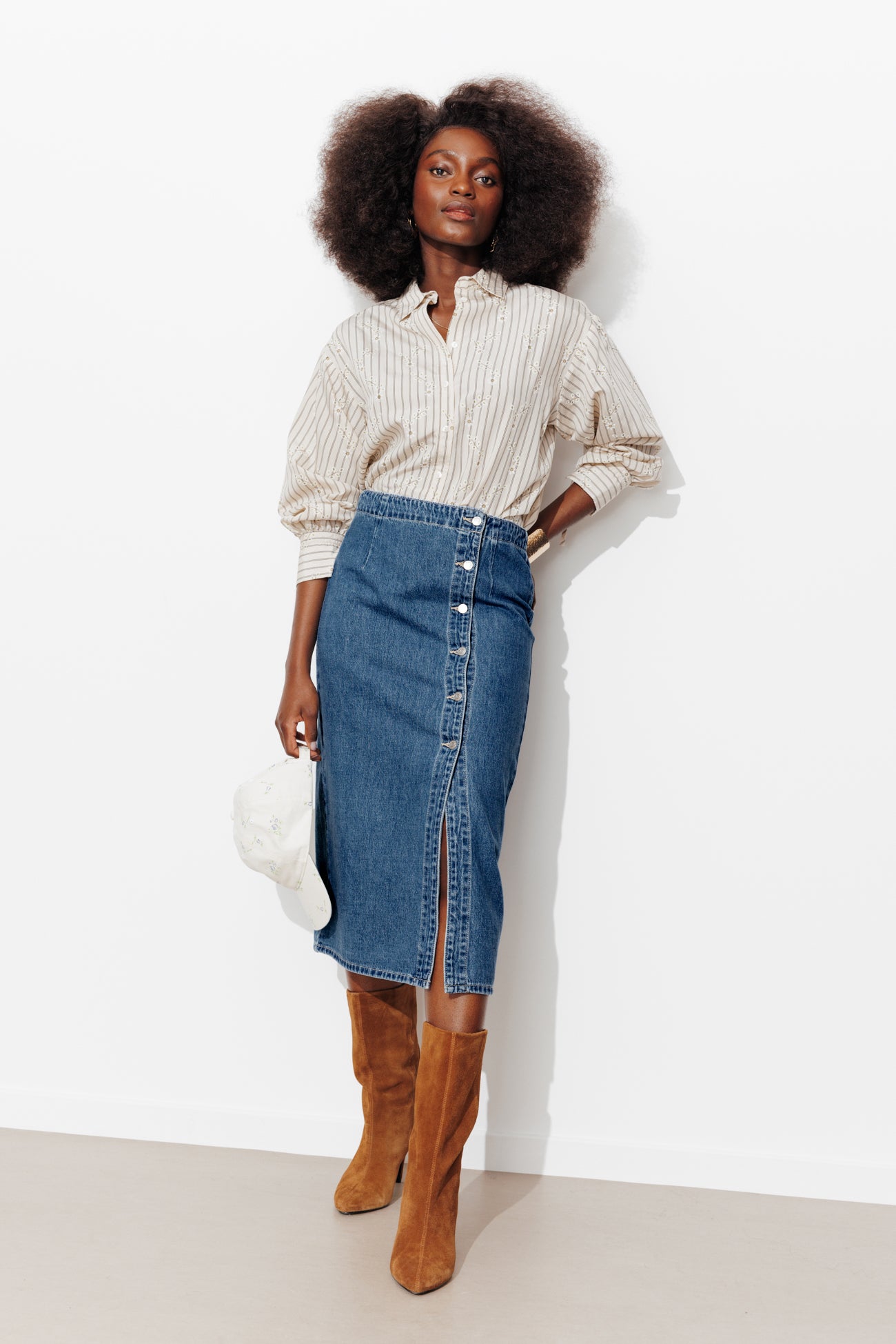 Midi denim skirt. A handy wardrobe item. All-season wear. Stylish new version featuring slanted stud buttoning down the front. Flattering shape. Front slit. In 100% cotton denim. Pencil shape. Straight lower hemline. Contrasting stitching. Includes recycled cotton.