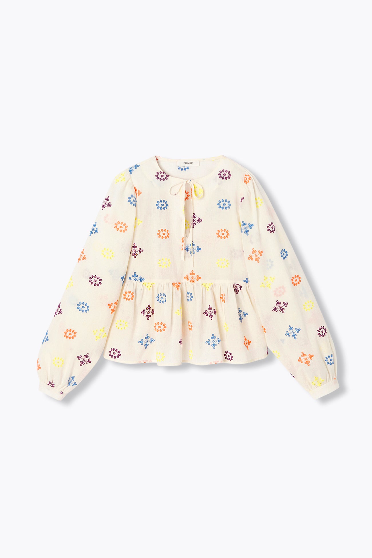 Pretty blouse featuring broderie anglaise in contemporary style. Original openwork embroidery. Loose shape. In soft cotton. Frilly lower hemline. Tunic neckline with ties. Long puff sleeves with shoulder gathers and elasticated cuffs. Curved lower hemline. Topstitched. Goes great with jeans, a pencil skirt or shorts. Includes organic cotton. Natural fibers, grown without pesticides, GM nor chemical fertilizers to protect biodiversity.