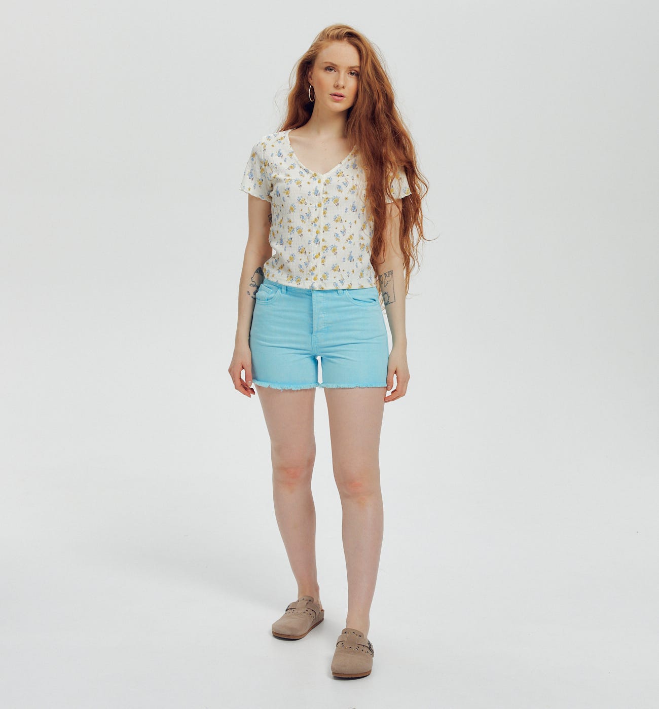 A passion for pastel! Denim shorts in a fresh pastel hue. Flattering high waist. Beltloops. Stud button and metal zip. 5 pockets. Frayed edges. Matched topstitching. Includes recycled cotton. From collected textiles, rewoven and reproduced into new clothes.
