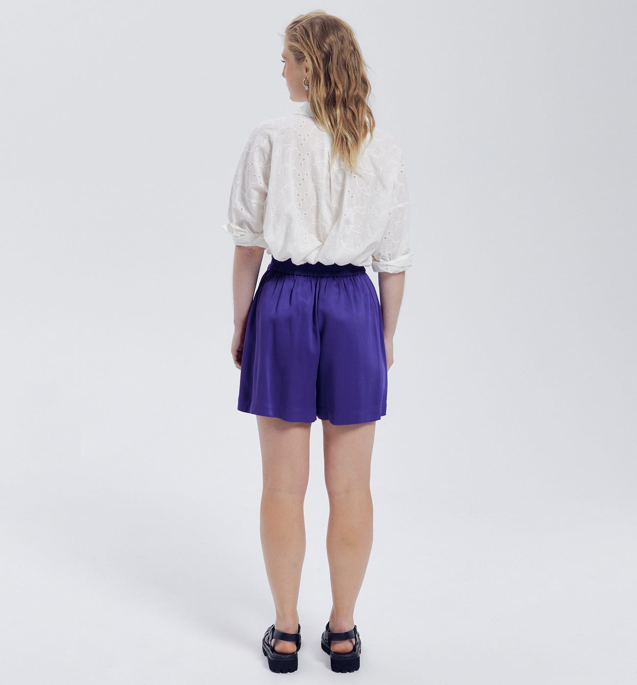 Soft drapy shorts, a pleasure to wear! High waist, elasticated at the back. Half belt to tie at the front. Beltloops. Front flat pleats. Italian pockets. Topstitched. Includes ecoviscose. In a soft fluid hang. From wood pulp from managed forests. When one tree is felled, another is planted.