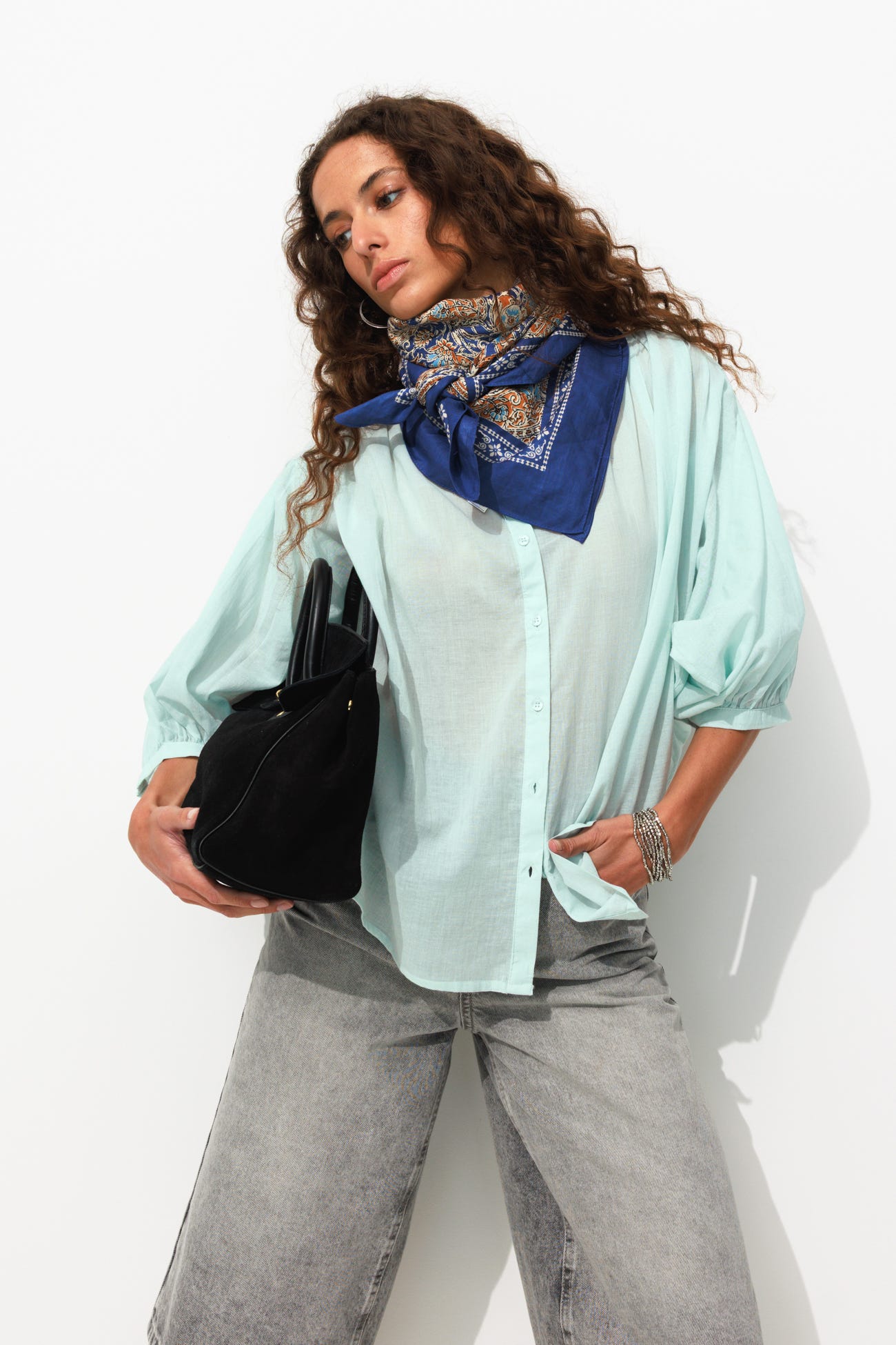 Airy oversized shirt. Cotton shirt in standout style! Round neck. Button front. Gathers on the shoulders and back. Half-length batwing sleeves with button ends. Curved lower hemline.Topstitched. In pure organic cotton: natural fibers, grown without pesticides, GM nor chemical fertilisers to protect biodiversity.