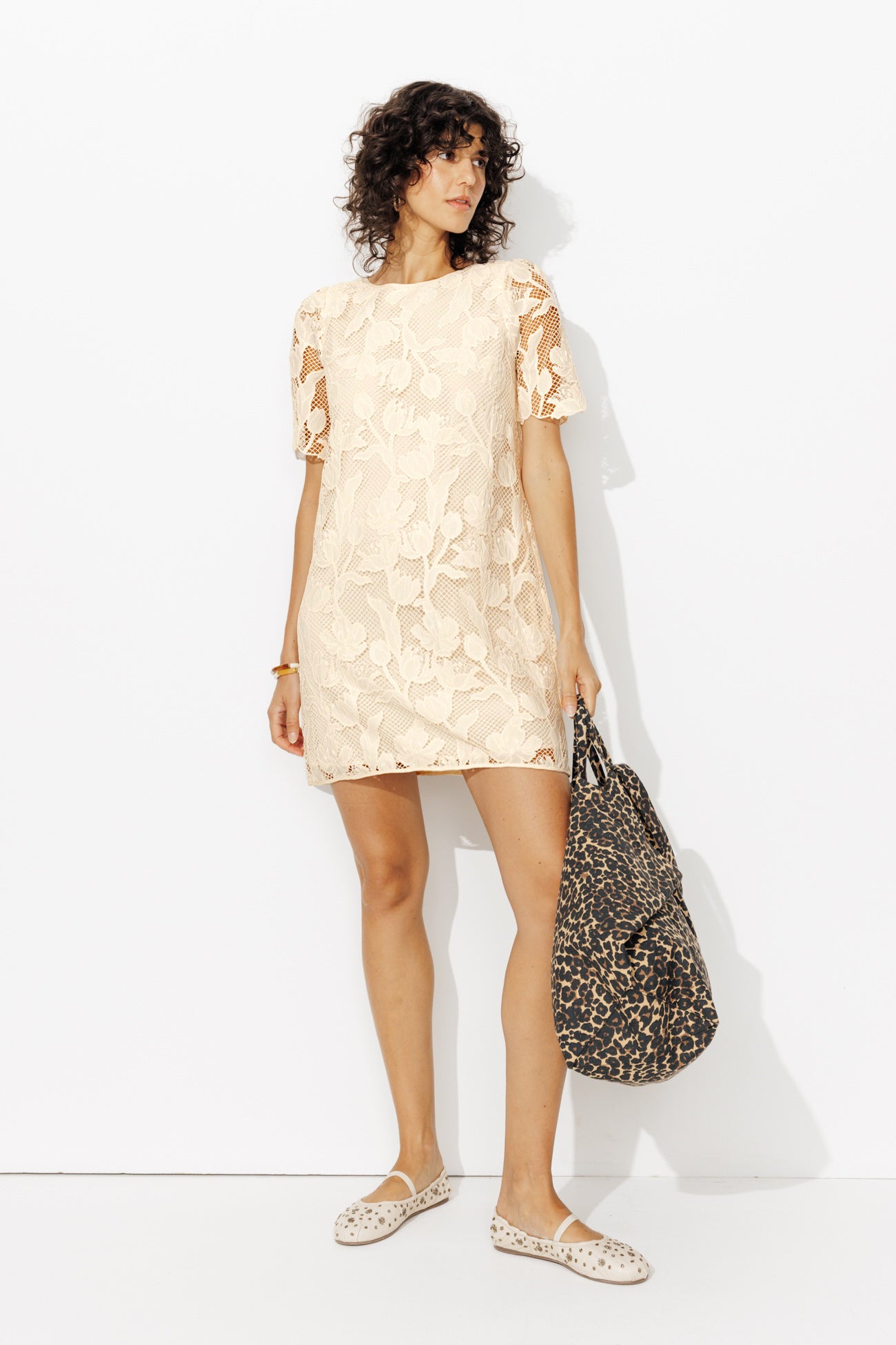 Fashionable short dress in retro chic style in eyecatching guipure and embroidery. Lined except for the sleeves. Straight shape. Wide round neckline. Upper back button slit. Structured shoulders. Short sleeves with fancy edge. Straight lower hemline with matching stitched bias trim. Perfect dress for a special occasion, major event or appointment.