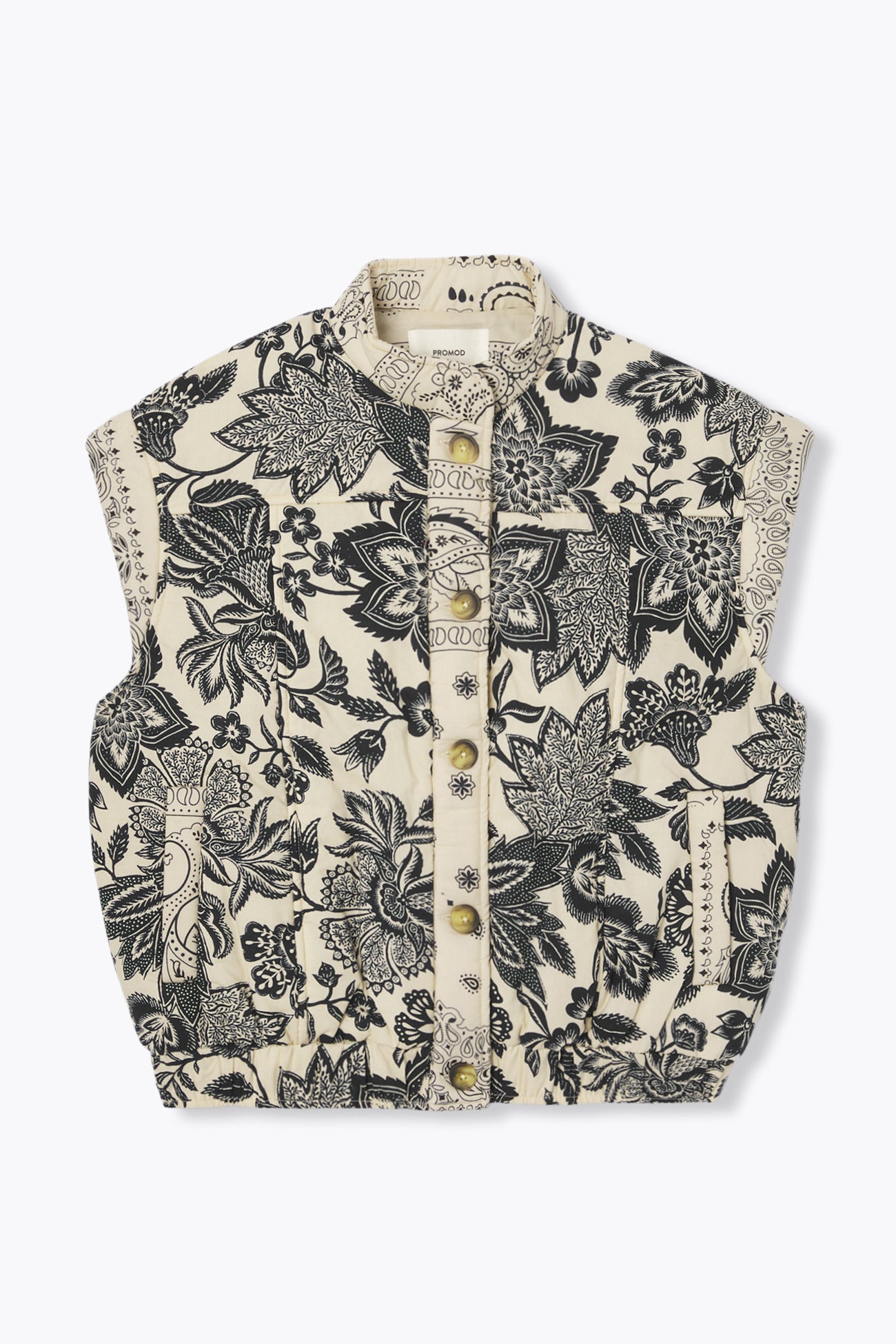 A fashion-savvy investment. Sleeveless padded jacket. In an eyecatching floral pattern. Perfect as we enter the spring season and all the way through to autumn! Elasticated lower hemline to create a slightly tapered shape. Raised collar. Button front. Padded shaped armholes. Two pockets. Patterned lining. In pure organic cotton. Natural fibers, grown without pesticides, GM nor chemical fertilizers to protect biodiversity.