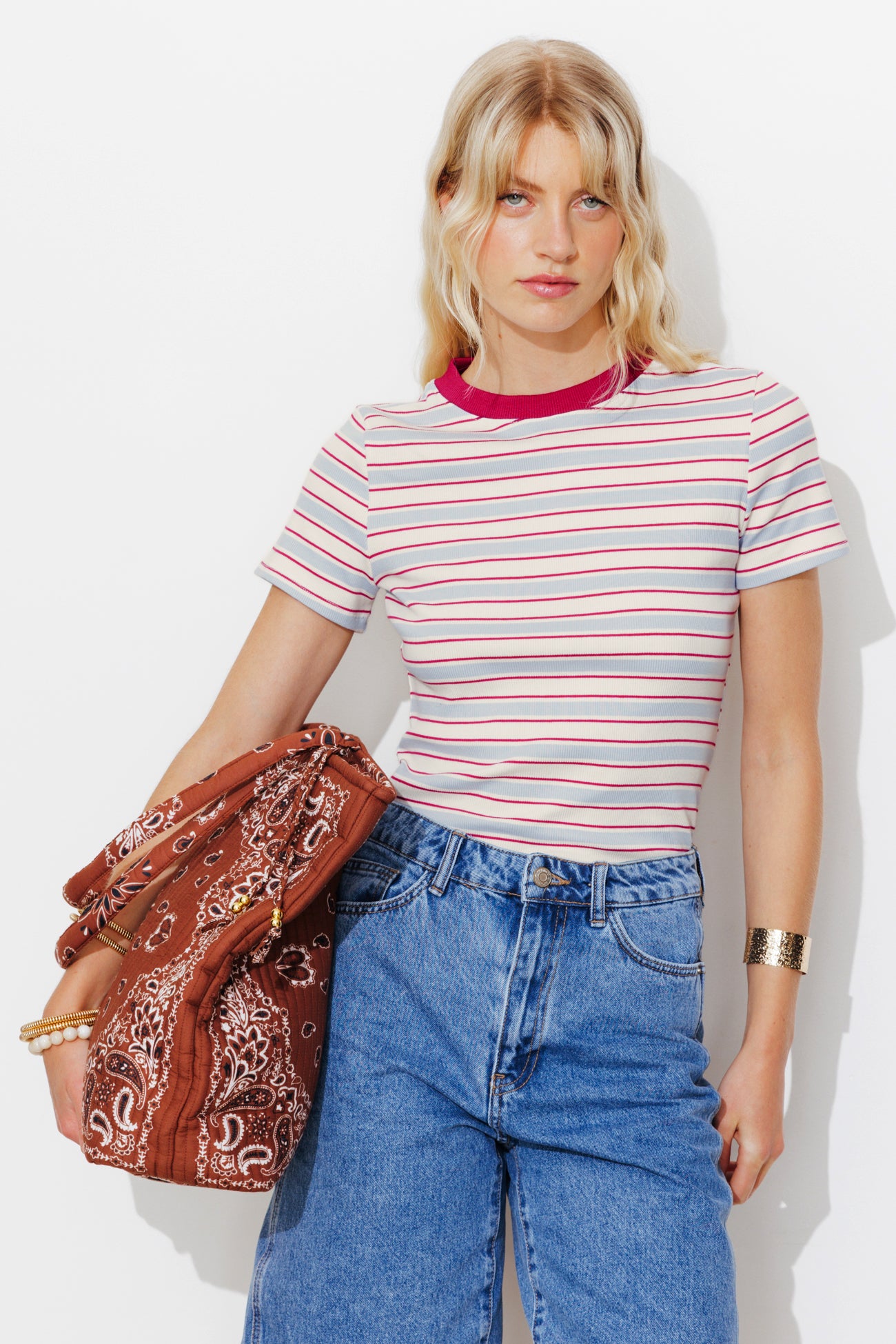 Cool spring-summer wear. Subtle retro fashion appeal. Bold graphic t-shirt in colourful narrow stripes. In soft rib jersey cotton. Contrasting round rib neckline. Fitted shape with elastane for gentle stretch, a pleasure to wear. Short sleeves. Slightly curved lower edge. Topstitched. Includes organic cotton. Natural fibers, grown without pesticides, GM nor chemical fertilizers to protect biodiversity.
