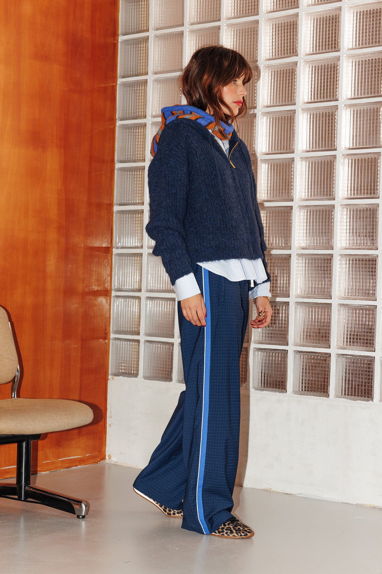 Wideleg trousers for both sporty and urban fashion appeal. In dainty checks in dyed threads. Stitched bias trim on the outer leg in a contrasting colour. In a soft feel, a pleasure to wear. With impeccable hang. Wideleg cut. Standard length. Button and concealed zip. Drawstring tie. Front pockets. Includes recycled fibres.